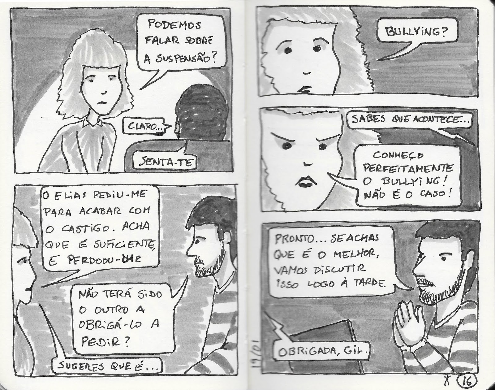 Num segundo período hospitalar, resolvi avançar com esta história, em que, munido de um conjunto de canetas e um pequeno caderno de bolso, me obriguei a avançar às cegas (rapidamente fugi até do que já tinha escrito). Em cada dia, desenhava uma ou duas páginas, sendo que o desenvolvimento da história era definido no momento. Ao acabar em cada dia, não fazia ideia do que me iria passar pela cabeça de seguida. Era como andar pela rua e encontrar sucessivamente novas pessoas e situações.